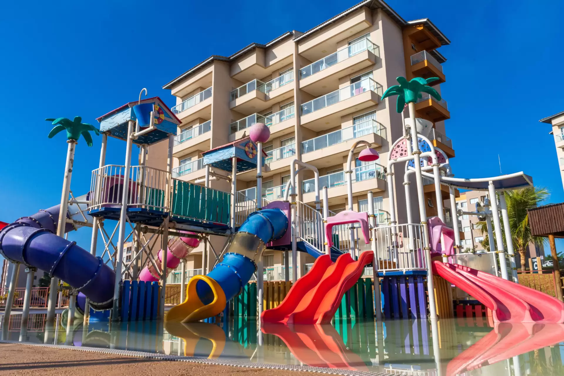 Parque aquático completo: piscinas termais e frias, duas de borda infinita, ofurôs, spa, quadras de esporte e playgrounds secos/molhados — lazer para todas as idades.